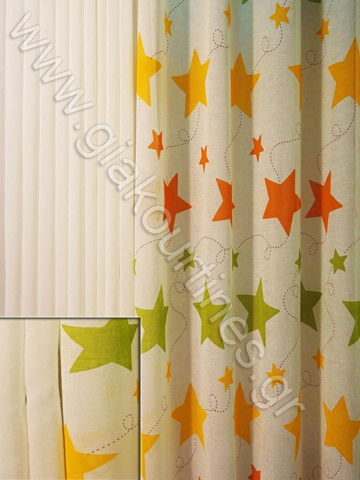 ΡΙΝΤΟ ΥΦΑΣΜΑ ΝΕΑΝΙΚΟ ΤΥΠΟΥ ΛΙΝΟ ΠΟΛΥΕΣΤΕΡ, ΧΡΩΜΑ ΥΠΟΛΕΥΚΟ ΜΕ ΑΣΤΕΡΙΑ ΠΟΡΤΟΚΑΛΙ, ΚΙΤΡΙΝΟ, ΛΑΧΑΝΙ. ΚΟΥΡΤΙΝΑ ΓΑΖΑ ΚΡΥΣΤΑΛΛΙΚΗ ΗΜΙΔΙΑΦΑΝΗ, ΧΡΩΜΑ ΥΠΟΛΕΥΚΟ.