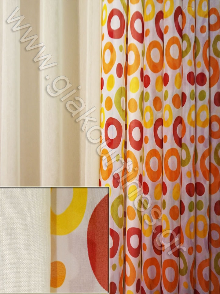 ΡΙΝΤΟ ΥΦΑΣΜΑ ΝΕΑΝΙΚΟ ΒΟΥΑΛ ΔΙΑΦΑΝΟ ΜΕ ΚΥΚΛΟΥΣ, ΧΡΩΜΑ ΚΟΚΚΙΝΟ, ΠΟΡΤΟΚΑΛΙ, ΠΡΑΣΙΝΟ. ΚΟΥΡΤΙΝΑ ΓΑΖΑ ΚΡΥΣΤΑΛΛΙΚΗ ΗΜΙΔΙΑΦΑΝΗ, ΧΡΩΜΑ ΥΠΟΛΕΥΚΟ. ΙΔΑΝΙΚΗ ΚΟΥΡΤΙΝΑ ΓΙΑ ΣΑΛΟΝΙ, ΚΑΘΙΣΤΙΚΟ Ή ΥΠΝΟΔΩΜΑΤΙΟ.