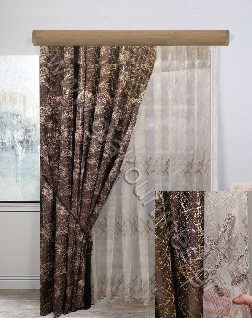 Εσωτερική κουρτίνα τούλινη οργαντίνα, ατσαλάκωτη, διάφανη, έτοιμη ραμμένη. Ύφασμα χυτό, μαλακό, Ευρωπαίκών προτύπων και ποιότητας.Το χρώμα της κουρτίνας είναι ουδέτερο τούλινο με κέντημα χρώμα μπεζοκαφέ. Διαθέτει φιστόνι στο τελείωμα.