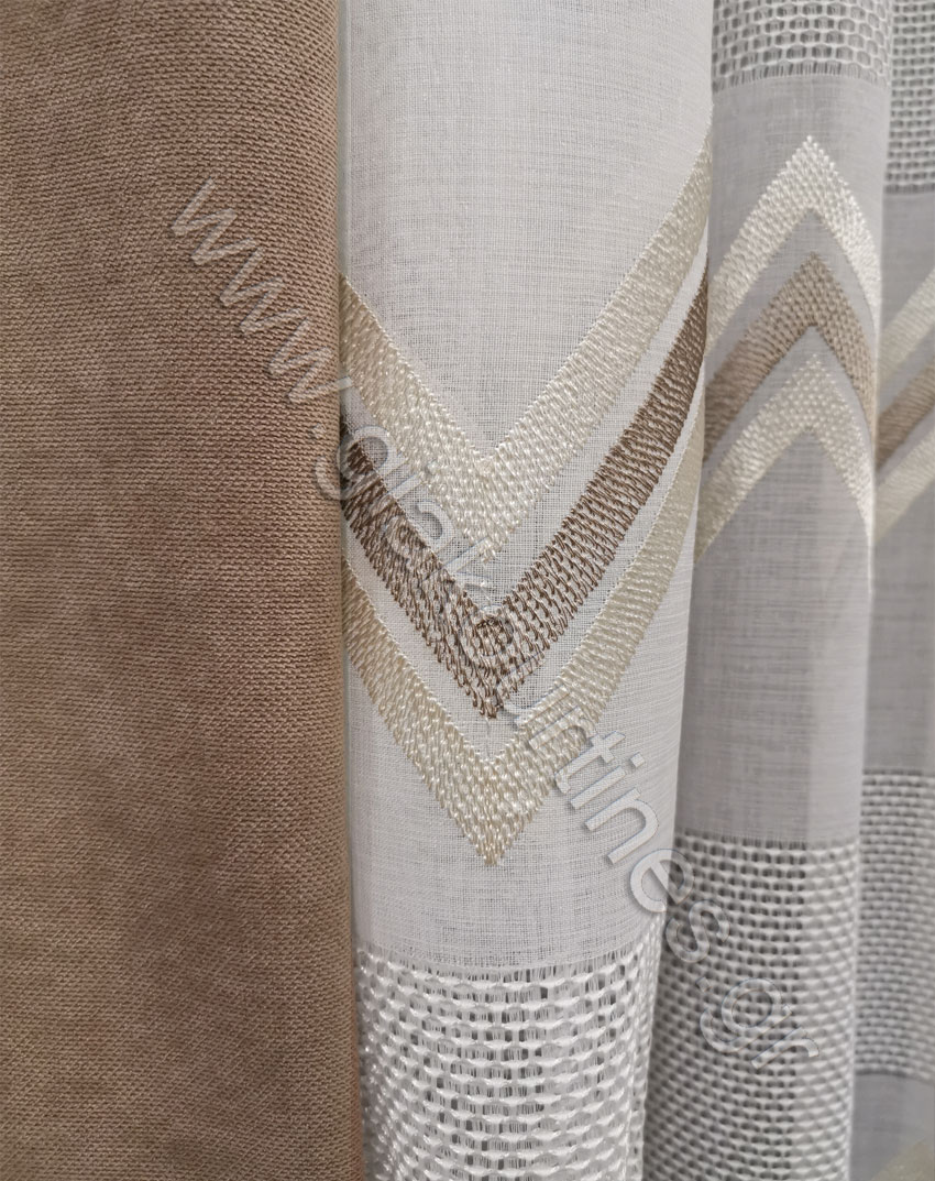 Εσωτερική κουρτίνα εξαιρετικά χυτή ,μερικής διαφάνειας, έτοιμη ραμμένη. Ύφασμα ματ, Ευρωπαίκών προτύπων και ποιότητας. Διαθέτει βαρίδι στο τελείωμα. Το χρώμα της κουρτίνας είναι λευκό με σχέδιο εναλλαγές ζικ ζακ και αζούρ. Το χρώμα από το μοτίβο είναι χρυσό και καφέ.