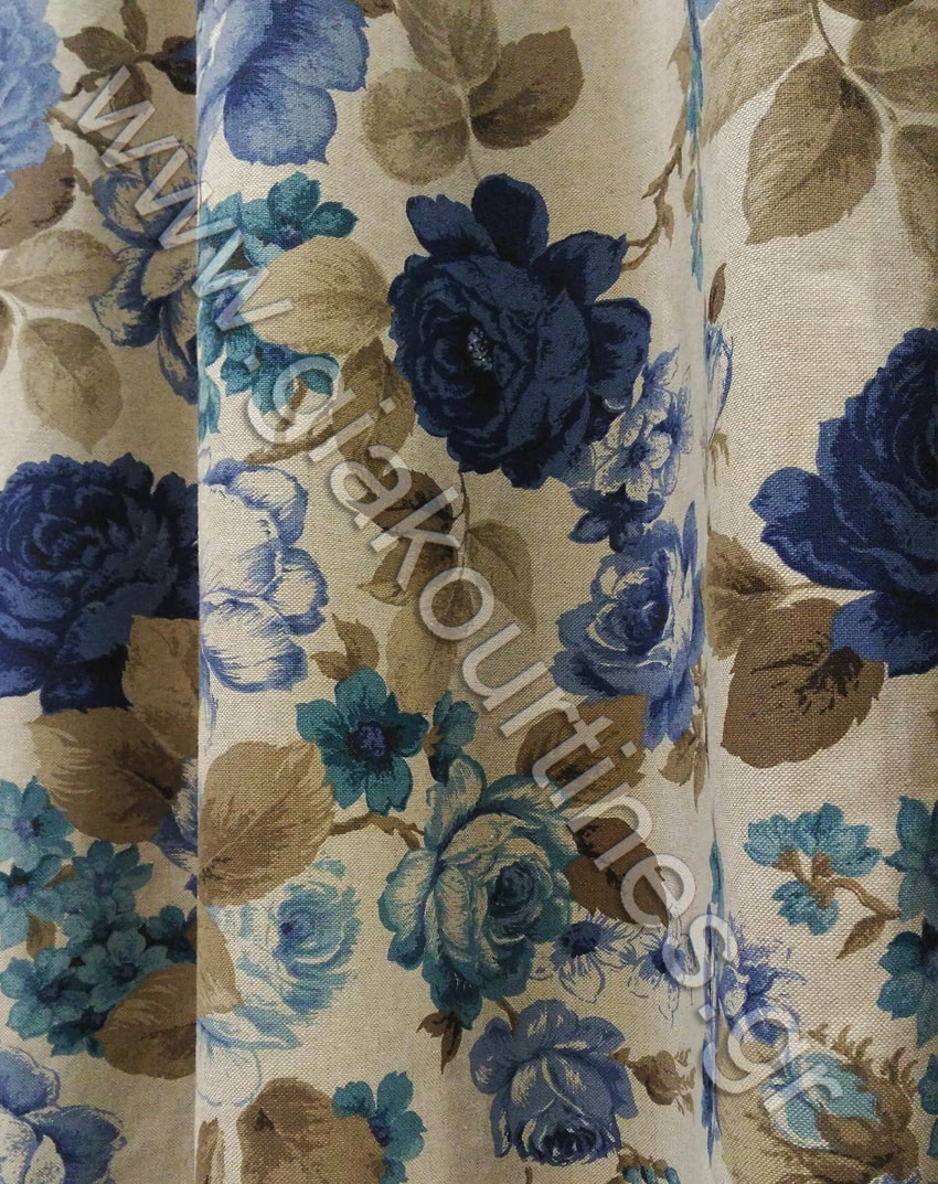 Ύφασμα αδιάφανο, λονέτα Ισπανίας εξαιρετικής ποιότητας. Το χρώμα της κουρτίνας είναι ουδέτερο της άμμου με μπλε σιέλ λουλούδια. Μπορεί να χρησιμοποιηθεί μόνη της, ως κουρτίνα σκίασης ή σε συνδυασμό με κάποια πιο λεπτή, ως ριντό ή ως ρόμαν πακέτο.