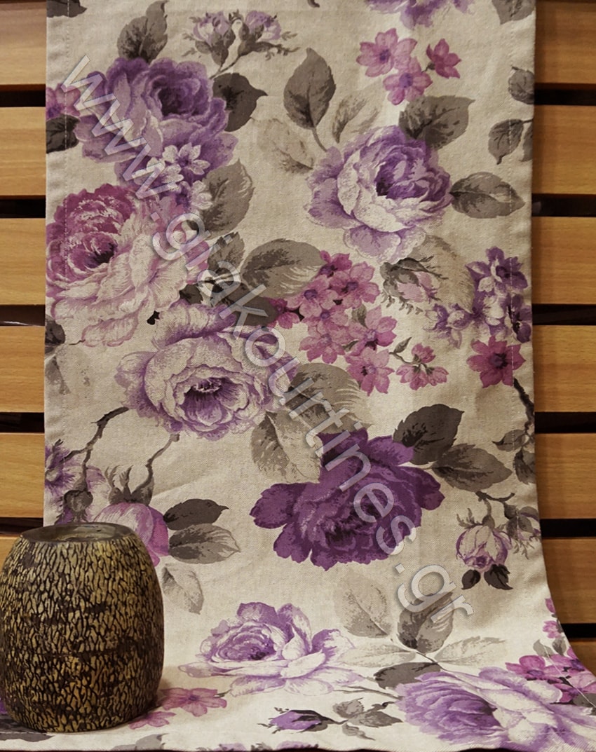 Ύφασμα αδιάφανο, λονέτα Ισπανίας εξαιρετικής ποιότητας. Το χρώμα της κουρτίνας είναι ουδέτερο της άμμου με λουλούδια αποχρώσεις του μωβ. Μπορεί να χρησιμοποιηθεί μόνη της, ως κουρτίνα σκίασης ή σε συνδυασμό με κάποια πιο λεπτή, ως ριντό ή ως ρόμαν πακέτο.