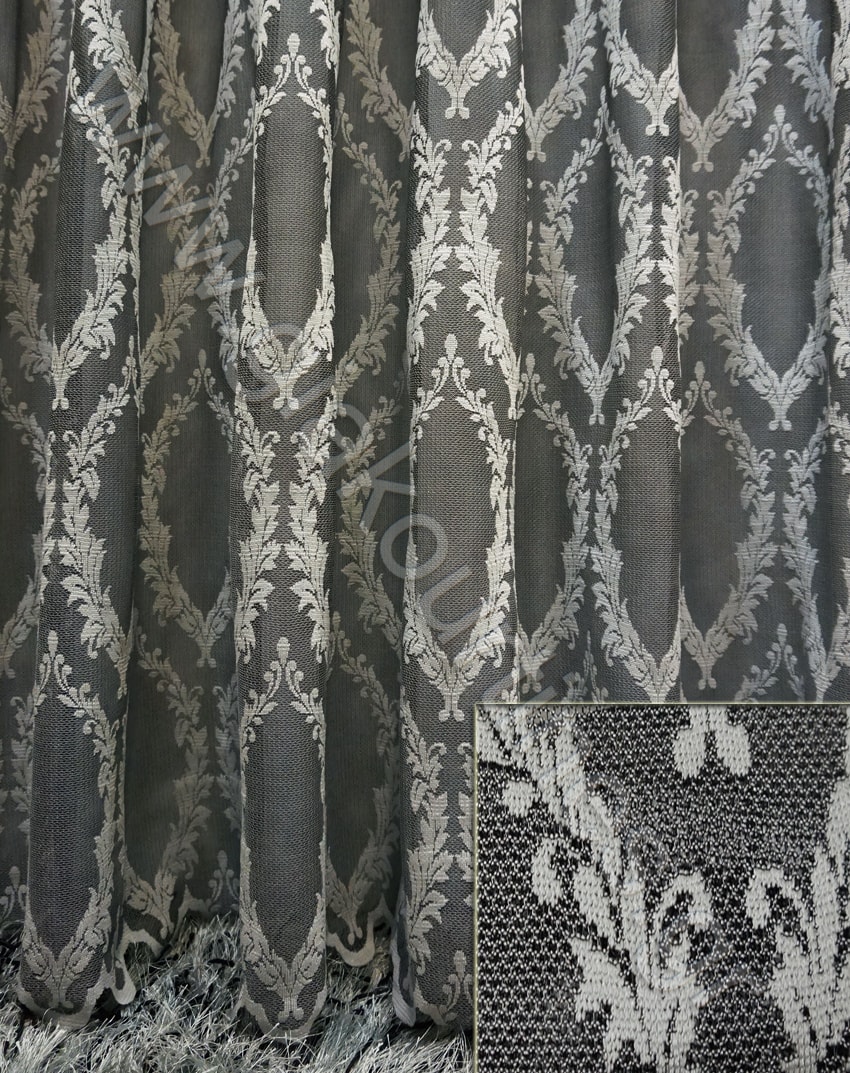 Κουρτίνα δαντέλα διάφανη. Είναι χυτό και σταθερό ύφασμα με μοντέρνο σχέδιο και φιστόνι στο τελείωμα. Το χρώμα της κουρτίνας είναι ανθρακί με ανοιχτό γκρι επαναλαμβανόμενο μοτίβο. Η κουρτίνα αυτή δεν χρειάζεται σίδερο. Μπορεί να χρησιμοποιηθεί ως κουρτίνα μόνη της ή σε συνδυασμό με κάποια πιο χοντρή, ριντό.