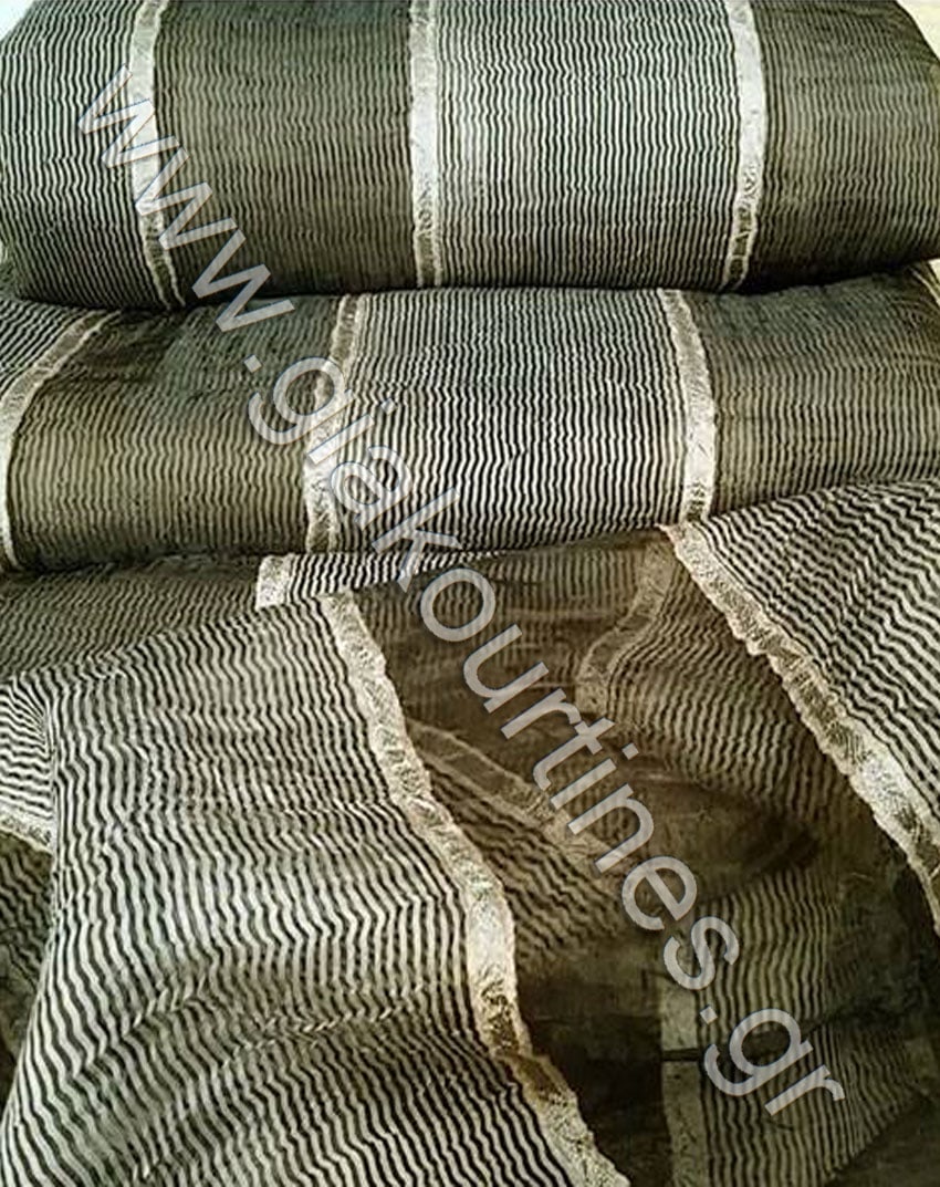 Κουρτίνα διάφανη οργάντζα ατσαλάκωτη, με ρίγες γκριζοασημί και πολύ σκούρο λαδί.