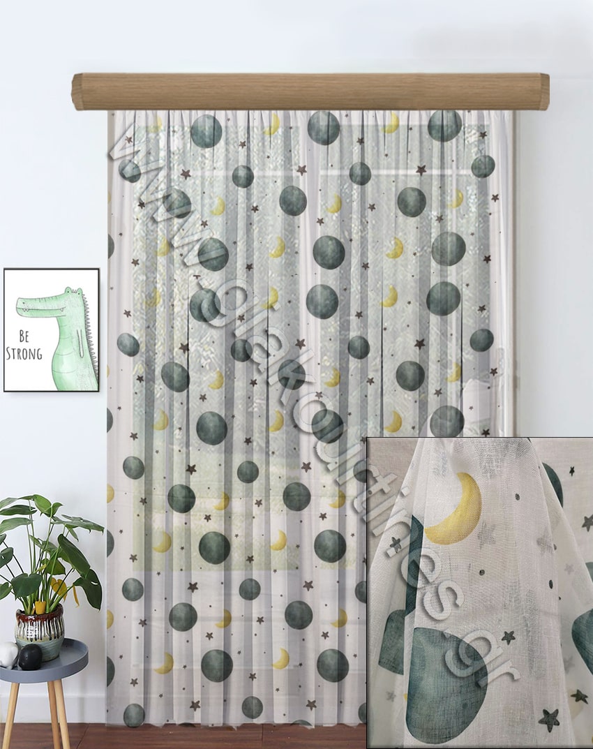 Κουρτίνα για παιδικό δωμάτιο έτοιμη ραμμένη. Εξαιρετικά χυτή, Ευρωπαίκών προτύπων και ποιότητας. Ποιότητα γάζα, βάση υπόλευκη με πλανήτες και αστεράκια