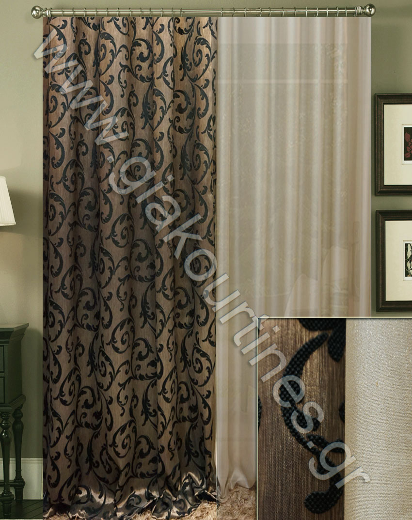 Ριντό αδιάφανο, ταφτάς πολυτελείας. Είναι ανάγλυφο μπαρόκ ύφασμα. Το χρώμα της κουρτίνας είναι καφέ με μαύρο μπαρόκ κλαδάκι.
