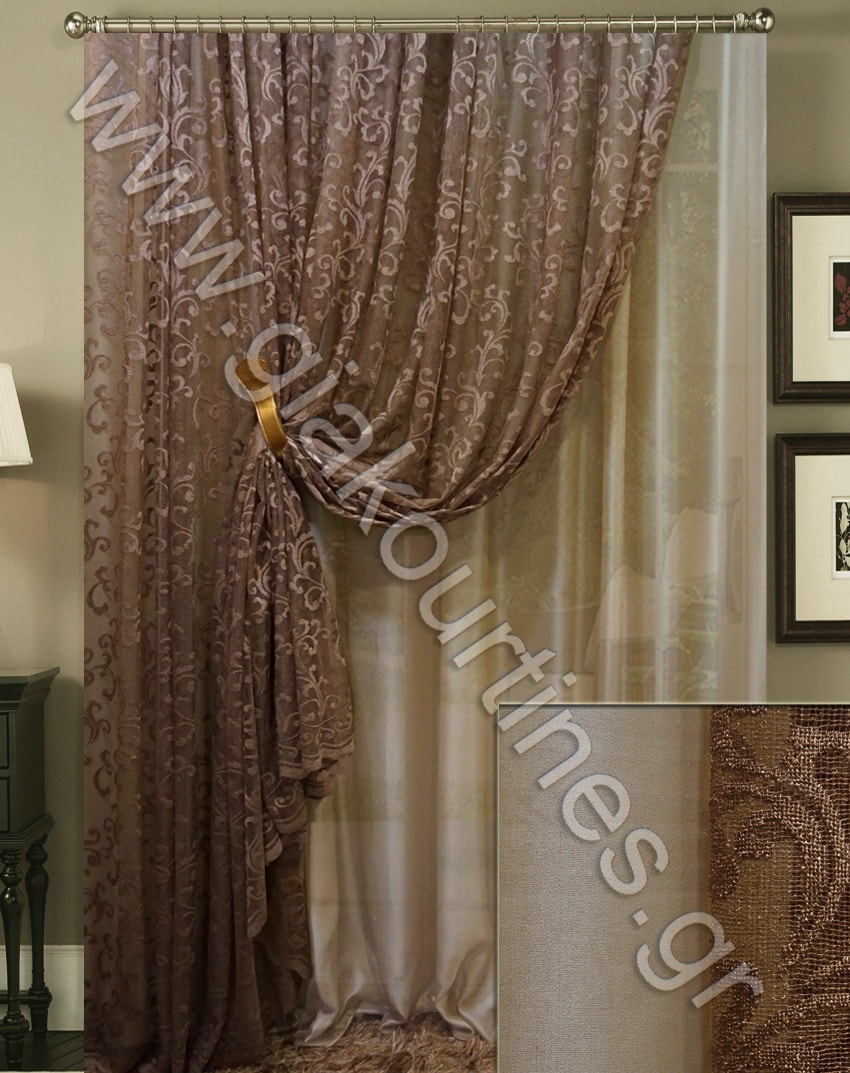 Ριντό κουρτίνα δαντέλα μπαρόκ διάφανη, με κλωστή φλος. Είναι χυτό και βαρύ ύφασμα με σχέδια μπαρόκ και φιστόνι στο τελείωμα. Το χρώμα της κουρτίνας είναι καφέ σοκολά. Η κουρτίνα αυτή δεν χρειάζεται σίδερο.