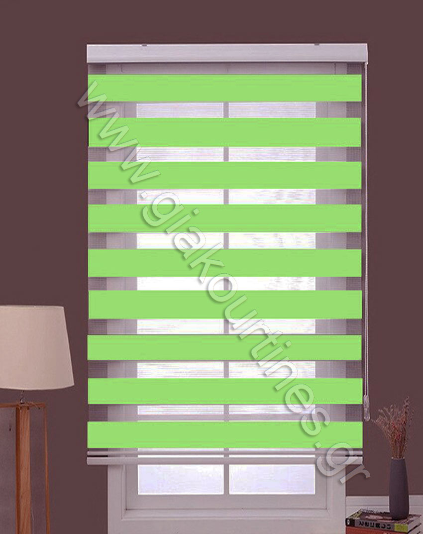 Ύφασμα 100% πολυέστερ με ανεξίτηλα χρώματα και φίλτρα UV για την απορρόφηση υπεριώδους ακτινοβολίας, Έχει μεγάλη αντοχή στον ήλιο και στον χρόνο. Διπλή ρολοκουρτίνα με δυνατότητα ρύθμισης να περνάει το φώς και να έχετε ορατότητα έξω ή να παρέχει σκίαση χωρίς οπτική επαφή με εξωτερικό χώρο.