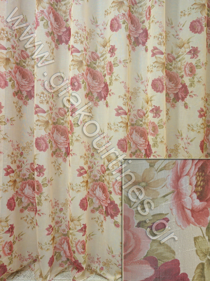 Κουρτίνα φλοράλ τύπου λινό πολυέστερ ημιδιάφανη. Είναι ατσαλάκωτο και χυτό ύφασμα με βαρίδιο στο τελείωμα. Το χρώμα της κουρτίνας είναι μπεζοεκρού με λουλούδια ροζ, σομόν, απαλό μπορντό. Η κουρτίνα αυτή δεν χρειάζεται σίδερο. Μπορεί να χρησιμοποιηθεί ως κουρτίνα μόνη της ή σε συνδυασμό με κάποια πιο χοντρή, ριντό.