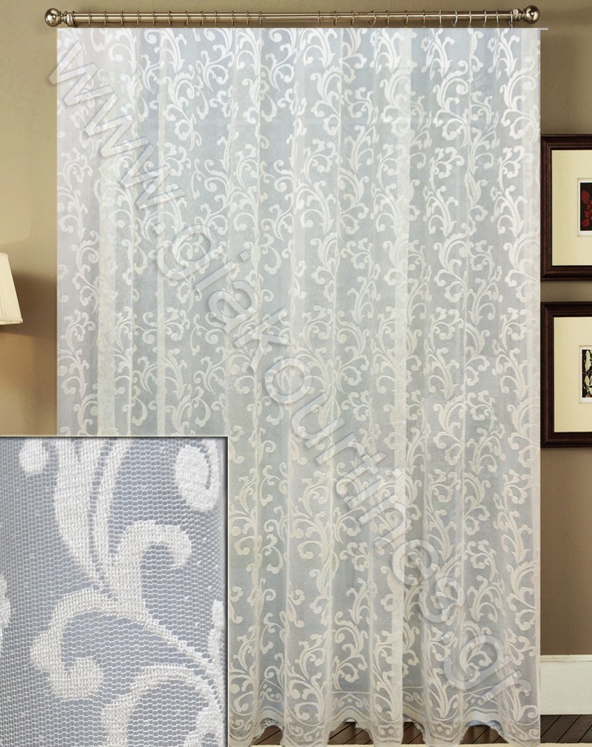 Κουρτίνα δαντέλα μπαρόκ διάφανη, με κλωστή φλος. Είναι χυτό και βαρύ ύφασμα με σχέδια μπαρόκ και φιστόνι στο τελείωμα. Το χρώμα της κουρτίνας είναι υπόλευκο. Η κουρτίνα αυτή δεν χρειάζεται σίδερο.  Μπορεί να χρησιμοποιηθεί ως κουρτίνα μόνη της ή σε συνδυασμό με κάποια πιο χοντρή, ριντόΕίναι ραμμένη στο εργαστήριο μας με ελληνική τρέσσα συνεχόμενη, 8 εκατοστών.