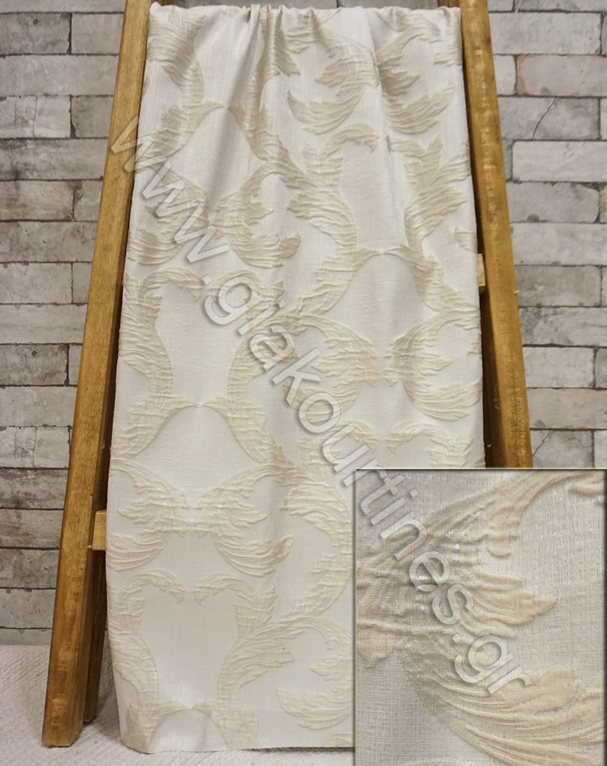 Ύφασμα για κουρτίνα, ζακάρ, εξαιρετικής ποιότητας, Ευρωπαϊκών προδιαγραφών. Το χρώμα του υφάσματος είναι μεταλλιζέ ιβουάρ. Ιδανικό για χώρους με υψηλή αισθητική, για ένα κομψό και επιβλητικό αποτέλεσμα.Μπορεί να χρησιμοποιηθεί μόνη της, ως κουρτίνα σκίασης ή σε συνδυασμό με κάποια πιο λεπτή, ως ριντό ή ως ρόμαν πακέτο.