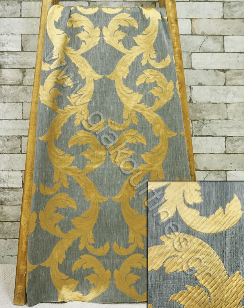 Ύφασμα για κουρτίνα, ζακάρ, εξαιρετικής ποιότητας, Ευρωπαϊκών προδιαγραφών. Το χρώμα του υφάσματος είναι παστέλ μπλε ανοιχτό με χρυσό κλαδί. Ιδανικό για χώρους με υψηλή αισθητική, για ένα κομψό και επιβλητικό αποτέλεσμα.Μπορεί να χρησιμοποιηθεί μόνη της, ως κουρτίνα σκίασης ή σε συνδυασμό με κάποια πιο λεπτή, ως ριντό ή ως ρόμαν πακέτο.