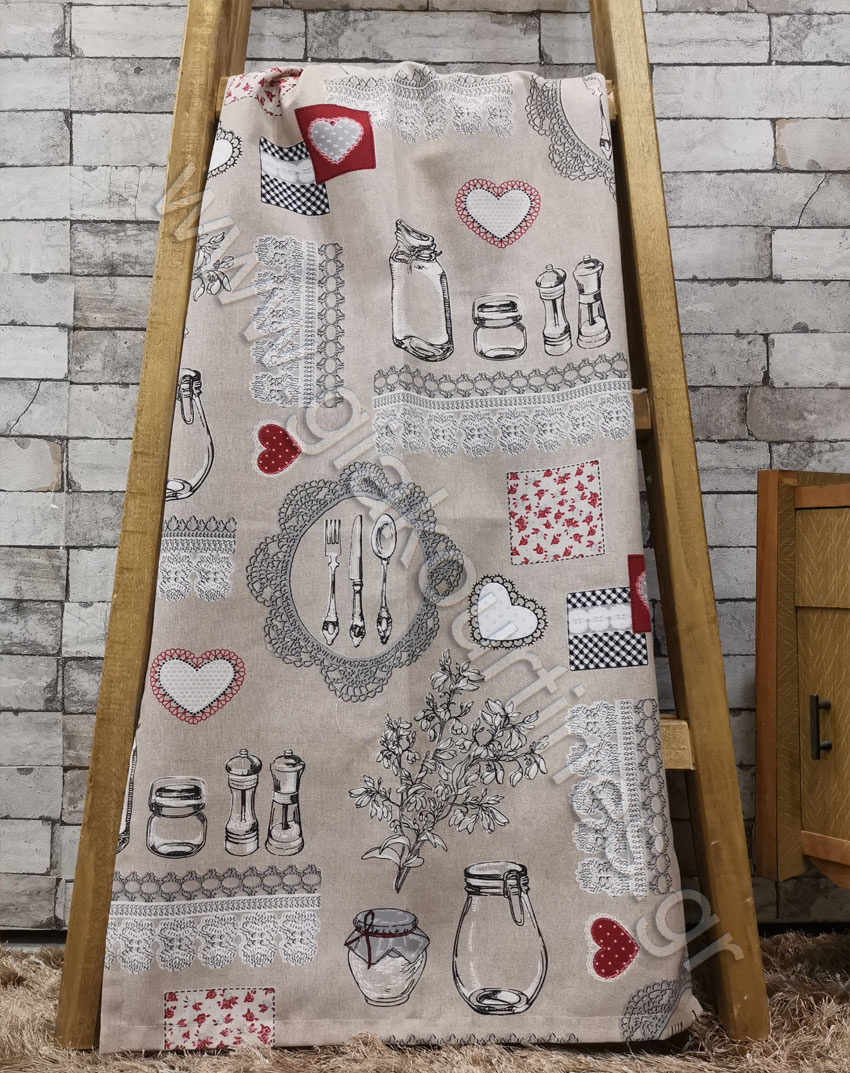 Ύφασμα για κουρτίνα , χωρίς διαφάνεια, λονέτα Ισπανίας άριστης ποιότητας. Βάση μπεζ με μοτίβα στοιχεία κουζίνας.