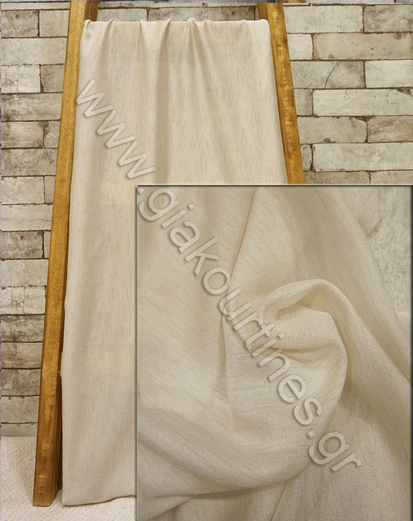 Ύφασμα για κουρτίνα με διαφάνεια, σταθερή, εξαιρετικά χυτή, Ευρωπαϊκών προδιαγραφών. Τα νήματα της είναι με τεχνητό μετάξι χρώματος μεταλλιζέ smokey άμμου . Δεν χρειάζεται σίδερο, διαθέτει βαρίδι στο τελείωμα.