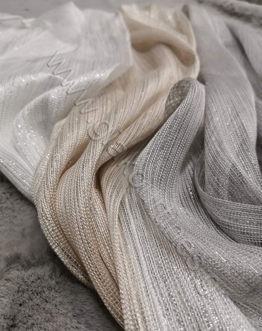 Ύφασμα για κουρτίνα με διαφάνεια, σταθερή, εξαιρετικά χυτή, Ευρωπαϊκών προδιαγραφών. Εξαιρετικά νήματα, με βαρίδι στο τελείωμα. Διαθέσιμο σε 3 αποχρώσεις, λευκό, μπεζ, γκρι με ασημί κλωστή glitter . Δεν χρειάζεται σίδερο, διαθέτει βαρίδι στο τελείωμα.