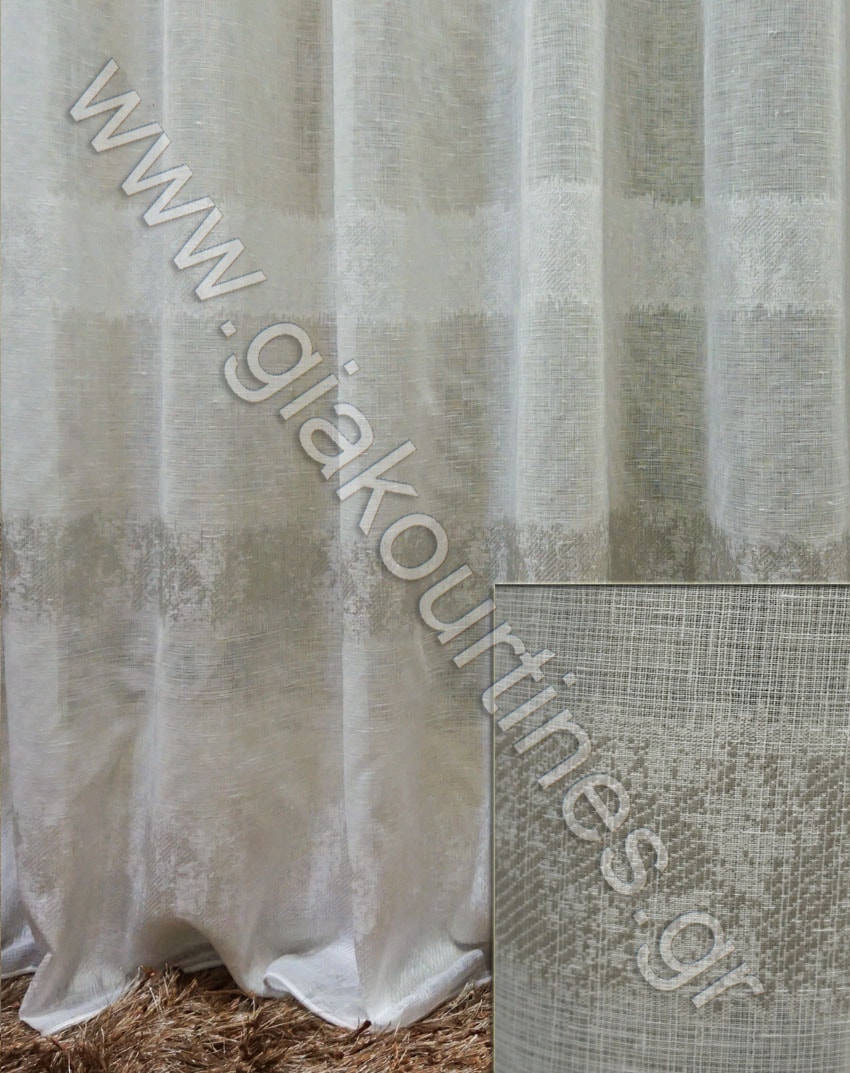 Κουρτίνα τύπου λινό πολυέστερ με ματ υφή, ημιδιάφανη. Μοντέρνο ύφασμα ατσαλάκωτο, με ύφανση οριζόντιες φαρδιές ρίγες. Το χρώμα της κουρτίνας είναι υπόλευκο με ρίγες υπόλευκες και γκρι ανοιχτό.Μπορεί να χρησιμοποιηθεί ως κουρτίνα μόνη της ή σε συνδυασμό με κάποια πιο χοντρή, ριντό.