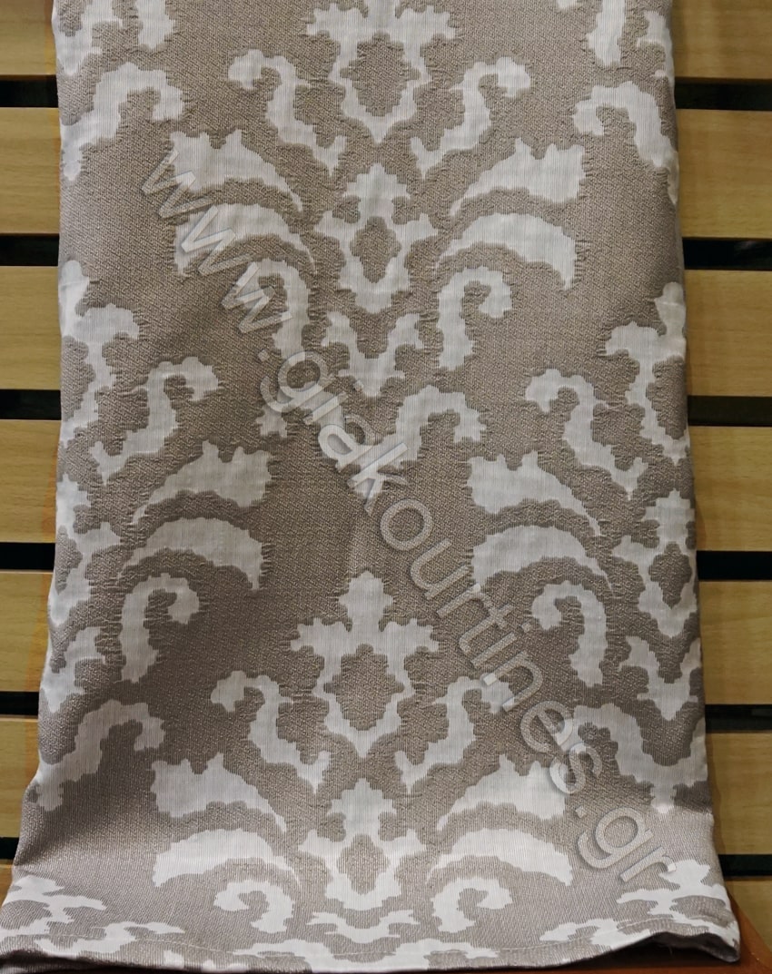 Ύφασμα για κουρτίνα,ποιότητα ματ ζακάρ. Το χρώμα της κουρτίνας είναι ουδέτερο παστέλ καφέ με μπαρόκ μοτίβο. Μπορεί να χρησιμοποιηθεί μόνη της, ως κουρτίνα σκίασης ή σε συνδυασμό με κάποια πιο λεπτή, ως ριντό ή ως ρόμαν πακέτο.