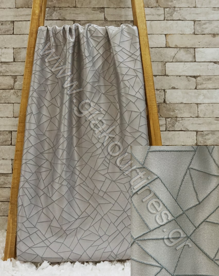 Ύφασμα για κουρτίνα, εξαιρετικά χυτό και μαλακό. Το χρώμα της κουρτίνας είναι γκρι με γεωμετρικά μοτίβα. Ό,τι πιο μοντέρνο σε χρώματα και σχέδια. Μπορεί να χρησιμοποιηθεί μόνη της, ως κουρτίνα σκίασης ή σε συνδυασμό με κάποια πιο λεπτή, ως ριντό ή ως ρόμαν πακέτο.