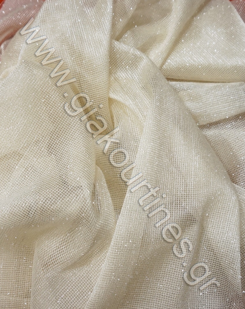 Κουρτίνα πολυτελείας διάφανη. Το χρώμα της κουρτίνας είναι ιβουάρ, υφαμένη με κλωστή με λάμψεις. Είναι ύφασμα που σιδερώνεται εύκολα. Μπορεί να χρησιμοποιηθεί ως κουρτίνα μόνη της ή σε συνδυασμό με κάποια πιο χοντρή ή ως ανάλαφρο ριντό.